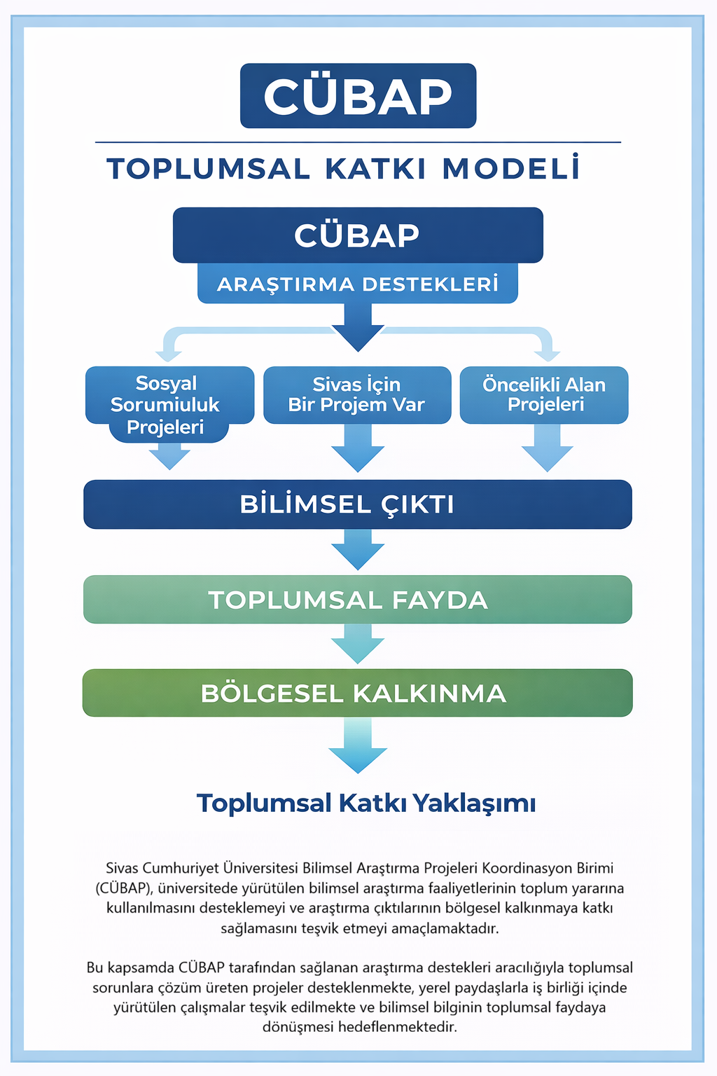 Cumhuriyet Üniversitesi Bilimsel Araştırma Projeleri Koordinasyon Birimi (CÜBAP), üniversitede yürütülen bilimsel araştırma faaliyetlerinin toplum yararına kullanılmasını desteklemeyi ve araştırma çıktılarının bölgesel kalkınmaya katkı sağlamasını teşvik etmeyi amaçlamaktadır. Bu doğrultuda CÜBAP tarafından desteklenen projeler aracılığıyla toplumsal sorunlara bilimsel çözümler geliştirilmesi, yerel paydaşlarla iş birliğinin güçlendirilmesi ve bilimsel bilginin toplumla buluşturulması hedeflenmektedir.
